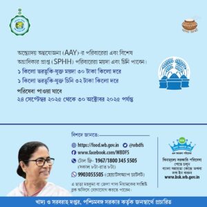 বর্তমানে পশ্চিমবঙ্গে বিভিন্ন সময় বিভিন্ন ক্ষেত্রে এবং বিভিন্ন পূজা উপলক্ষে অনেক সময় ফ্রিতে রেশন প্রোভাইড করা হয় এবং বাড়তি রেশন প্রোভাইড করা হয়। তো সে ক্ষেত্রে ২০২৫ এ ও দুর্গা পূজা উপলক্ষে বাড়তি রেশন প্রোভাইড করা হচ্ছে ।